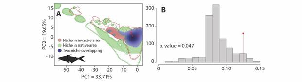 Comparison between the native niche and introduction niche of P. hypophthalmus: For the comparisons between the introduction and the native niche, we obtained PCA that explains 53.36 % of the variance, with a Schoener’s D value of 0.125, an expansion of 24 %, and stability of 76 % (Fig. 1A). On the other hand, similarity tests show that native and introduced range niches are more similar to what is expected by chance (P = 0.047; Fig. 1B). Therefore, the niche of P. hypophthalmus has significantly conserved non-native area.