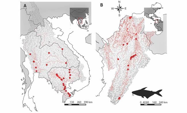 Pangasianodon hypophthalmus (Sauvage, 1878) family Pangasiidae (Siluriformes) is native to the Mekong and Chao Phraya rivers basin in Southeast Asia. It carries out long-distance movements during hundreds of kilometers between ecosystems in high areas and spawning habitats. This species uses floodplain lands to feed and breed (FAO, 2010; IAvH, s.f.; Tarkan et al., 2020). A female in suitable conditions can produce around 100 000 eggs per kilogram in each oviposition, and its demersal embryos suggest some parental care (e.g., nests on a hard substrate). These hatch in 24 hours, and the larvae drift in favor of the floods, searching for growth zones within flooded areas. Its larvae have an omnivorous diet that includes algae, seeds, crustaceans, zooplankton, and fish (Van Zalinge, Lieng, Ngor, Heng, & Valbo-Jørgensen, 2002). As an adult, it is carnivorous and even cannibalistic. The species has been reported as a predator of native species in some places of Asia (Pallewatta, Reaser, & Gutierrez, 2003).