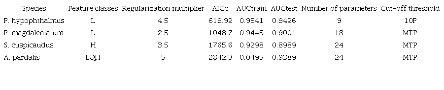 In the construction of the P. hypophthalmus model, we used the Jackknife method (Pearson, Raxworthy, Nakamura, & Peterson, 2007) with 31 folds given the low number of obtained records, while for native species, we used the random kfold method, 10 000 background points by default, and the combination of feature classes (Linear, Quadratic, Linear-Quadratic, Hinge, Linear-Quadratic-Hinge) with ten regularization values (0.5 to 5, each 0.5). The best model for each species was selected, bearing in mind that the lowest ΔAIC (the best models taking into account the smallest number of parameters, Muscarella et al., 2014) and the logistic output were used for all models. Finally, we converted the suitability map to binary map using the 10P cut-off threshold value (tenth percentile) for the P. hypophthalmusand MTP (minimal training presence) threshold value for the native species.