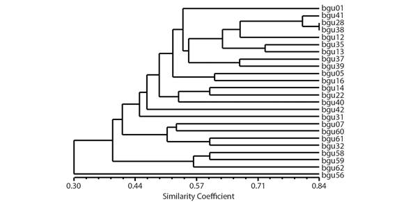 SSR polymorphism: All of the SSR loci had a good amplification pattern in the polyacrylamide gel (6 %). The allelic diversity ranged from two to seven alleles per locus, with an average of 3.5 alleles per locus (Table 1). The polymorphic information content ranged from 0.195 to 0.778 (Table 1). The expected heterozygosity varied from 0.195 to 0.822 and the observed heterozygosity ranged from 0.167 to 0.958.