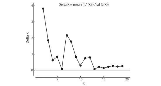The accessions were grouped using the program STRUCTURE 2.3.4 (Pritchard, Stephens, & Donnelly, 2000) and the Markov Monte Carlo chain (MCMC), with 100 000 permutations and 100 000 simulations for cluster inferences. Ten runs were performed for each K value (number of possible clusters). Using STRUCTURE HARVEST (Earl & vonHoldt, 2012), the ΔK value was calculated to detect the probable number of clusters (Evanno, Regnaut, & Goudet, 2005).