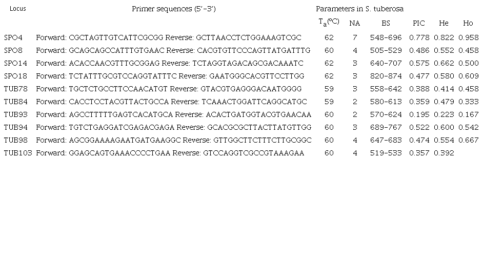 Methods: DNA was extracted, using the CTAB 2x method, from leaf samples of 24 accessions of S. tuberosa available in the germplasm bank at Embrapa Semiárido, Brazil. Ten microsatellite loci were used in this study.