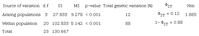 The analysis of molecular variance of 24 individuals the umbu tree from four distinct populations revealed that only 12 % of the genetic variability is between populations and 88 % of the variability is within populations (Table 2).