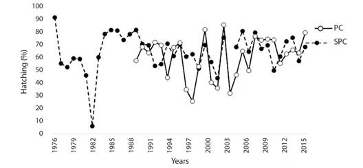 Hatching success: HS showed great variability over the years at both beaches. However, since 2009, these oscillations stabilized for both beaches (Fig. 2). HS percentages of 65.09 ± 14.72 % for SPC and 60.72 ± 16.39 % for PC were estimated, and these values were not statistically significant between beaches (Mann-Whitney U = 486, P = 0.360).