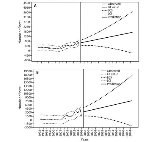 Prospective nesting in 2045: According to the annual data analyzed, a predictive time-series model with Brown exponential smoothing was constructed; in both cases, the residual values were independent (DF= 17, Ljung-Box Q (18) = 9.492, P= 0.924 for SPC; DF= 17, Ljung-Box Q (18) = 6.498, P= 0.989 for PC). The observed values have annual variations but suggest a positive trend, as shown by the adjusted values for both beaches (Fig. 3A, Fig. 3B). From a stationary R2 of 0.649, the prediction for 2045 is 1 733 [-215, 3 681] nests at SPC (Fig. 3A) and 7 718 [-2 435, 17 871] nests at PC, with a stationary R2 of 0.632 (Fig. 3B).