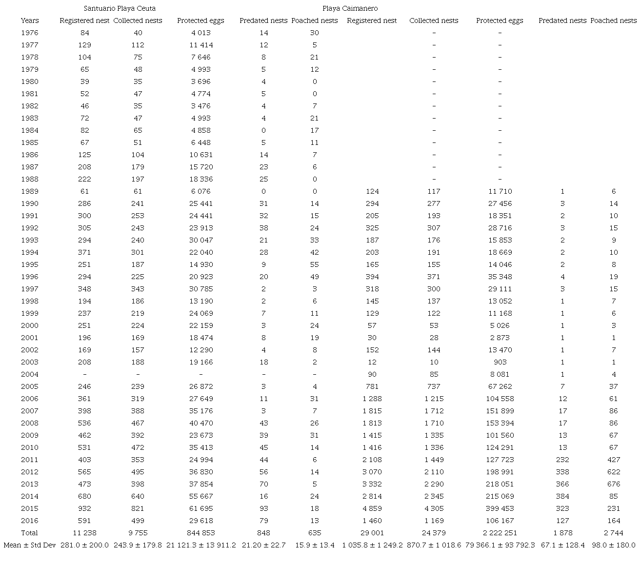Registered and collected nests and predation and poaching: At SPC from 1976 to 2016, a total of 11 238 nests were registered, of which 9 755 were collected, 848 were predated, and 635 were poached (Table 1); at this beach, before 1992, the collection of nests was variable (mean= 99.4 ± 75.4 nests per year). This was because the same effort was not made for technical reasons, but in 1992, the effort was standardized, and since then, the number of nests was approximately 340.2 ± 164 nests/year, although there were nesting seasons with less than 200 nests/year (1995= 187, 1998= 186, 2001= 169, 2002= 157 and 2003= 188). In 2004, it was not possible to work due to budget constraints. At PC, only data from 1989 to 2016 were considered event though protection began in 1986; before 1989, there were technical and operational difficulties preventing consistent monitoring, and some data were lost. During the study period a total of 29 001 nests were registered, of which 24 379 were collected, 1 878 were predated and 2 744 were poached. The average number of registered nests before 2005 was 176.9 ± 110.1 nests/year, and after 2005, the abundance of nests increased to 2 180.9 ± 1 144.6 nests/year. The 2015 season had the highest nesting record (4 859 nests) (Table 1). When comparing the parameters between nesting beaches, no significant differences were identified (P > 0.05).