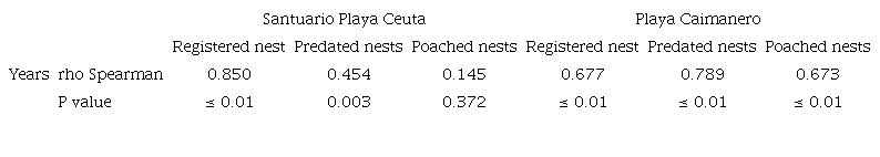 Nesting, predation, and poaching trends: For both nesting beaches, a positive and significant correlation was observed between the number of registered nests and time (rho = 0.850, P ≤ 0.01 for SPC, rho = 0.677, P ≤ 0.01 for PC, Table 2) and between predated nests and time (rho = 0.454, P = 0.003 for SPC, rho = 0.789, P ≤ 0.01 for PC, Table 2). The average number of poached nests at SPC was 15.9 ± 13.4 nests/year (Table 1). A positive and significant correlation between the number of poached nests (98.0 ± 180.0 nests/year) and time was observed (rho = 0.673, P = 0.01; Table 2) for only PC.