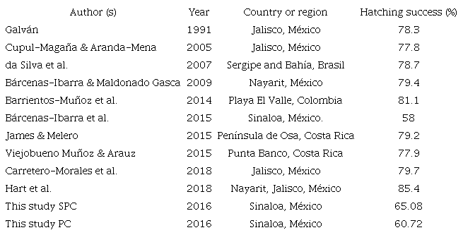 Similar HS was recorded at both beaches (65.09 and 60.72 % for SPC and PC, respectively); these values were close to those reported by Bárcenas-Ibarra et al. (2015) for El Verde Camacho (58 %). Other studies have reported a HS rate ranging between 75 and 85 % (Table 3). However, these studies were conducted in more Southern latitudes of the Mexican Pacific, except for the study by da Silva et al. (2007). A lower HS rate was reported for olive ridley turtles than for other species, such as hawksbill and green sea turtles (Bárcenas-Ibarra et al., 2015); this discrepancy could be because for other species, incubation regularly occurs in situ, while for the olive ridley turtle, nests are artificially incubated or relocated to hatcheries, which affects mortality and HS (Mrosovsky, 1982). However, at an olive ridley nesting beach in Costa Rica, Viejobueno Muñoz and Arauz (2015) reported a HS rate of 61.38 % for in situ nests, while the HS rate for nests relocated to a hatchery was 77.9 % (Table 3). It is necessary to compare the HS rates of in situ and relocated nests to guide management decisions, although predation and poaching may limit these analyses for both nesting beaches. Another factor influencing the incidence of HS is temperature, as it has been shown that in some cases, temperature exceeds the pivotal point of embryonic mortality (Rafferty & Reina, 2014; Sandoval, 2012). In addition, it is important to consider different management-related factors, such as losses that occur during monitoring phases on the beaches since these also affect HS but are rarely evaluated.