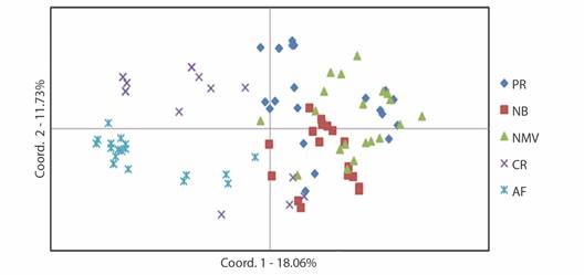 The PCoA explained 29.79 % of the total variation, with 18.06 % for the first component, 11.73 % for the second (Fig. 2).