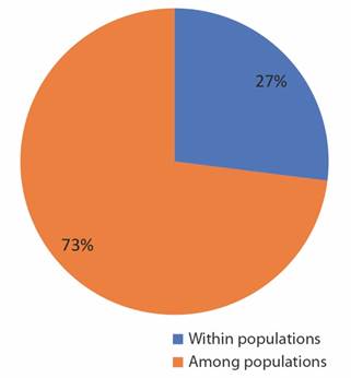 As in the other clusters, we observe the formation of two groups and the individuals were allocated according to the previous groupings generated by UPGMA (Fig. 1B) and by Structure (Fig. 1C). AMOVA revealed that 73 % of the total variance occurred within populations and 27 % among populations (Fig. 3).