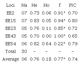 All loci analyzed in this study were highly informative, confirming the transferability of the microsatellites from E. edullis to E. precatoria. According to Botstein et al. (1980) Polymorphism Information Content (PIC) values below 0.25 are considered uninformative, those that reveal values between 0.25 and 0.50 are classified as moderately informative and above 0.50 highly informative. Oliveira et al. (2010) when transferring the same markers from E. edullis to E. oleracea found the PIC value of 0.86 for primers EE23 and EE54, highly informative values.