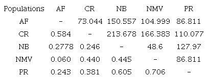 Table 3 shows the results of genetic diversity by population. The PR population was the one with the highest number of alleles, followed by the populations of NMV and NB. The analysis by loci and the analysis by populations showed that the number of homozygotes was greater than that of heterozygotes. The fixation index was positive for all populations, which confirms the greater number of homozygotes and the low frequency of heterozygotes in the sampled populations. The AF population showed the lowest He (0.441) and f (0.537) values and the highest heterozygosity observed. It was not observed any null allele in the analysis.