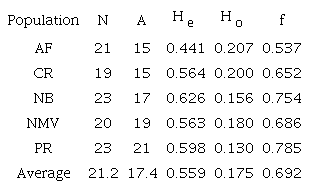 In this study, all loci presented f values above 0.22, indicating excess of homozygotes in the populations, according to Azevedo et al. (2007), the fixation index value varies between -1 and +1, positive values indicate excess homozygote, negative values excess of heterozygotes and zero is the value found for a population in Hardy-Weinberg equilibrium.