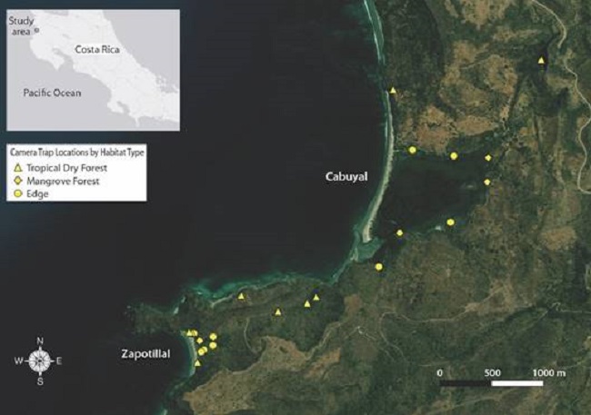 Methods: The study was conducted in a 7 km2 matrix of mangrove and tropical dry forests between Cabuyal and Zapotillal bays in Northwestern Costa Rica, south of Santa Rosa National Park. From September 2017 to March 2018, we used 13 automatic camera traps over 1 498 trap days to capture species utilizing the region and assess their patterns of habitat usage both spatially and temporally.