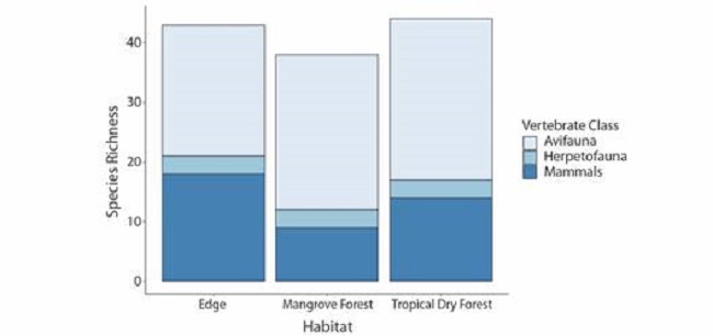 Resultados: Se detectaron 70 especies de vertebrados de 42 familias y 27 órdenes, incluidas varias especies amenazadas a nivel mundial. Más de la mitad de todas las especies se encontraron en un solo hábitat, particularmente aves (78 %) y mamíferos (42 %). Los bosques secos tropicales albergan el mayor número de especies únicas y sustentan un mayor porcentaje de herbívoros que los hábitats de borde de manglares, que estaban dominados u hospedados por especies carnívoras y omnívoras. Las detecciones promedio por cámara trampa de todas las especies aumentaron significativamente desde el mes más frío y húmedo (octubre) hasta los meses más cálidos y secos (enero y febrero) en los bosques secos tropicales. El análisis de rarefacción basado en muestras reveló que la duración del estudio fue suficiente para muestrear los hábitats de bosque seco tropical y de borde, aunque los manglares requieren más muestreo.