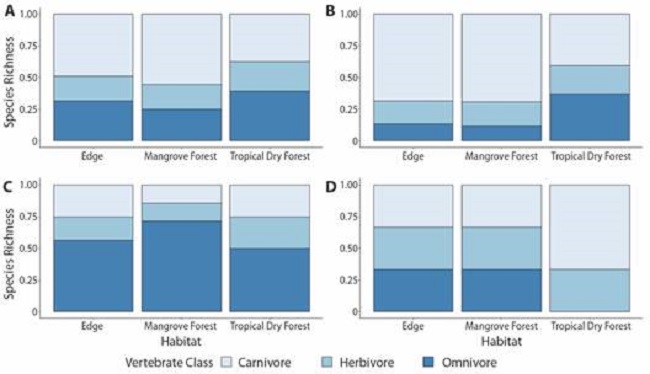 Conclusiones: Se encontró que los taxones pueden usar varios tipos de bosque en las diferentes etapas de su ciclo de vida, moviéndose entre áreas a medida que las condiciones ambientales cambian a lo largo del año. En nuestro estudio se confirmaron patrones generales de la biodiversidad global que favorecen el uso de los bosques de manglar por parte de carnívoros y omnívoros.