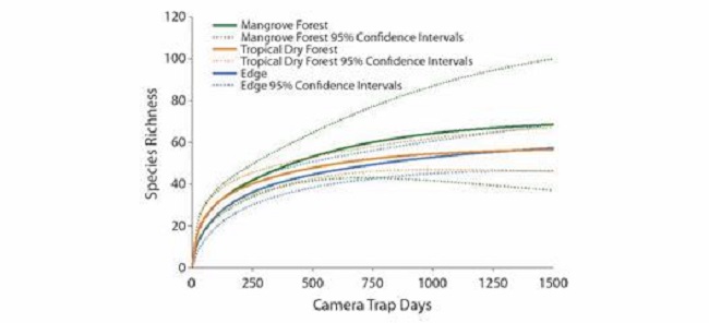 Results: Seventy vertebrate species from 42 families in 27 orders were detected, including several globally threatened species. Over half of all species were detected in only one habitat, particularly amongst avian (78 %) and mammalian (42 %) species. Tropical dry forests hosted the greatest number of unique species and supported a greater percentage of herbivores than mangrove or edge habitats, which were dominated by carnivorous and omnivorous species. Mean detections per camera trap of all species increased significantly from the coldest and wettest month (Oct) to the hottest and driest months (Jan & Feb) in tropical dry forests. Sample-based rarefaction analysis revealed that survey length was sufficient to sample the tropical dry forest and edge habitats, though mangroves require further sampling.
