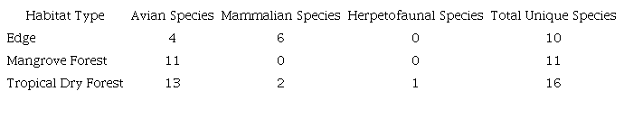 Tropical dry forests and associated mangrove estuaries are considered more species poor than other forest types in the tropics, so when combined with the historical deforestation and fragmentation in the area, the overall diversity of species found in this region was surprising (Jiménez, 2004). The unique assemblages of species which occur within each habitat type as well as the high overall biodiversity between them highlights the importance of the tropical dry forest-mangrove forest matrix towards maintenance of biodiversity in the area.