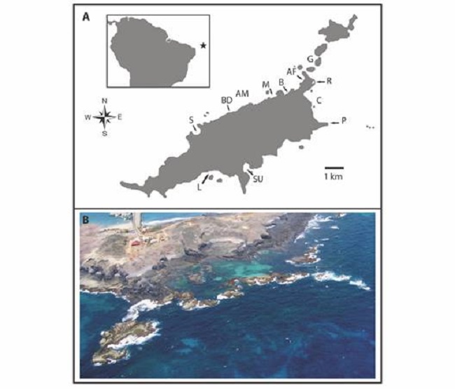 Underwater observations: Snorkeling surveys were conducted between 2004 and 2014 at different sites on the main island of FEN. However, most of the observations were concentrated in a lagoon with approximately 44 000 m2 located at the windward side of FEN, in which adult lemon sharks are known to aggregate (Fig. 1A, site R; Fig. 1B). Named as “Buraco da Raquel”, this lagoon is subject of rough seas and thus surveys were occasionally performed, depending on calmer sea conditions, which usually occur during the austral summer (from December to March). Surveys conducted in the lagoon and elsewhere usually consisted of one or two divers following random routes in depths ranging from 0.5 to 5 m, searching for lemon sharks. Upon sighting a shark, digital photographs and videos were taken. Each dive lasted approximately 50 min and was performed in slow and constant speed, with no changes in direction or itinerary. All dives were performed during daylight hours (06:00 to 18:00 h), in absence of large waves (> 1 m), and with water visibility of at least 4 m. The approximate total length (TL) of all sharks sighted was estimated at up to 2 m of total length (TL) or ≥ 2 m TL, based on comparison with objects such as rocks and patch reefs.