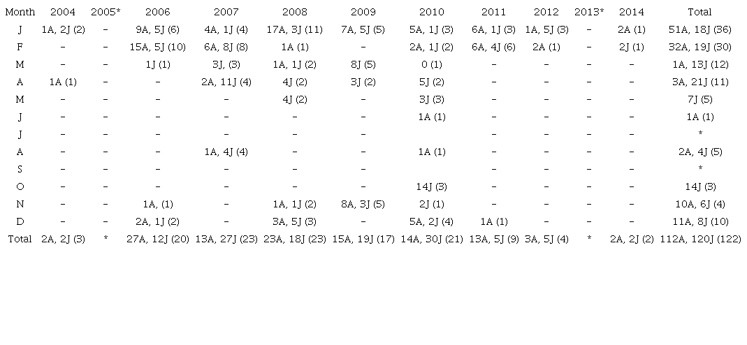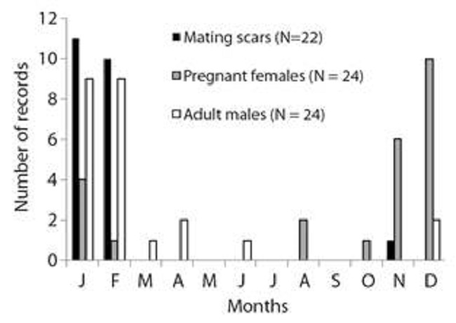 Females presenting fresh scars were recorded in 22 of the 181 dives (18 % of the total). These scars were considered as mating-related wounds since they were predominantly associated to gills or observed between the pectoral and pelvic girdles (Fig. 2A, Fig. 2B, Fig. 2C). Pregnant females were recorded in 24 dives (19 %) (Fig. 2D, Fig. 2E, Fig. 2F). Adult males were sighted in 24 dives (18 %), including an individual presenting fresh scars (Fig. 2G, Fig. 2H, Fig. 2I). A summary of the numbers of females with mating scars, pregnant females, and adult males observed per month between 2004 and 2014 is presented in Fig. 3.