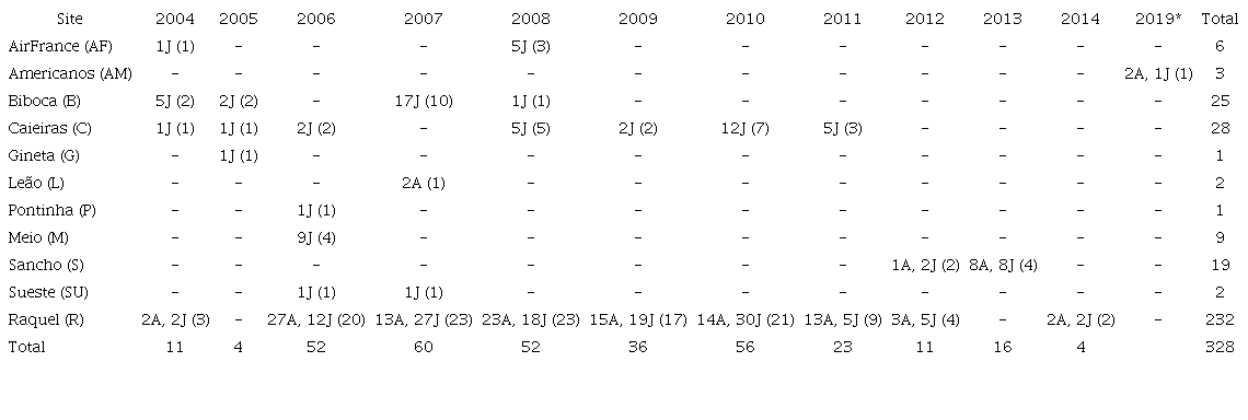 Underwater observations: A total of 328 records of N. brevirostris were reported from 177 dives made by tourists and residents (approximately 148 h of underwater observations) (Table 1). Dives were concentrated during the austral summer (December to March), when sea conditions were better. The number of lemon sharks ≥ 2 m TL sighted per dive ranged from 1 to 12 individuals (mean= 1 ± 1). Solitary individuals were spotted in 42 dives. Most of the records came from the “Buraco da Raquel” lagoon (site R; 232 records in 122 dives) (Table 2).