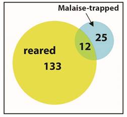 One: Dasch (1974) treated a very small proportion of ACG Mesochorus species, therefore few synonyms will be generated in our current effort which does not attempt to match his names with Costa Rican specimens. The proportion of the total ACG Mesochorus species can be estimated by comparing the percentage of Malaise-trapped species with those reared by Janzen, Hallwachs and their team over 37 years (Fig. 1). 145 species were reared, and 37 species were captured in Malaise traps in the same forests. The overlap between these two collecting techniques is 12 species. Only 32.4 % (12/37) of the Malaise-trapped species were also reared. This suggests that the reared species represent only 32.4 % of the total number of ACG species of Mesochorus occurring in ACG. Extrapolating from this percentage (145/0.324) there are an estimated 447.5 species of Mesochorus in ACG. ACG has 65 % or less of the Costa Rican fauna and flora of the well-documented taxa, e.g., birds, angiosperms, mammals, butterflies. Under the assumption that Mesochorus diversity follows this pattern there are a predicted 688 (447.5/0.65) species of Mesochorus in Costa Rica.