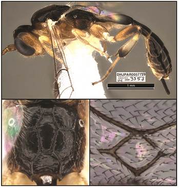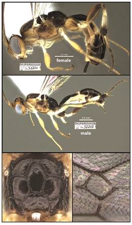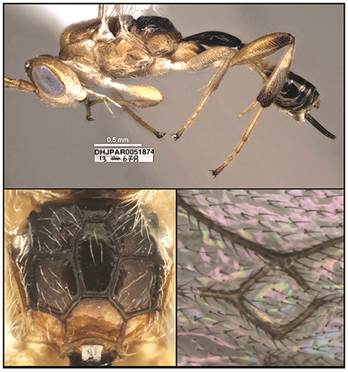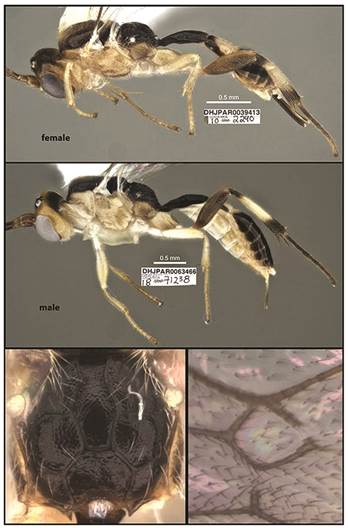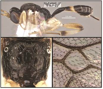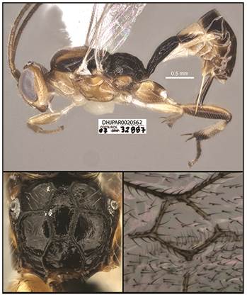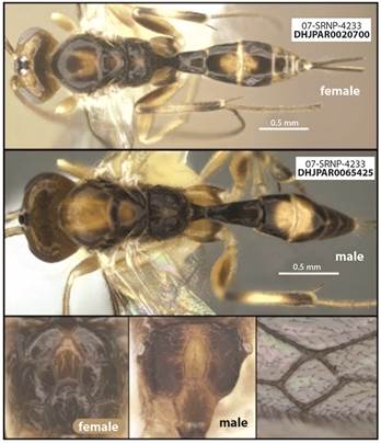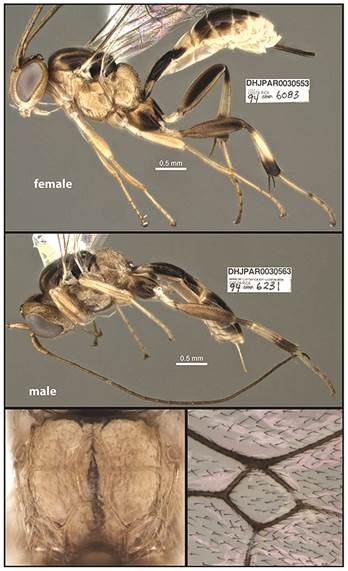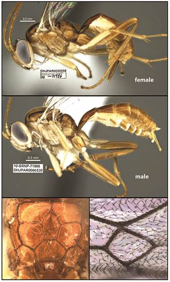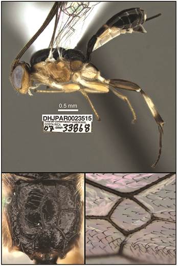 Holotype female: DHJPAR0020700, Área de Conservación Guanacaste, Alajuela, Sector San Cristobal, Sendero Palo Alto, 10.88186, -85.38221, 570 m, eclosion date 11/14/2007, host caterpillar collection date 10/26/2007, 07-SRNP-4233 (CNC). GenBank accession code OM237688.