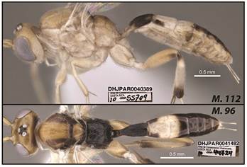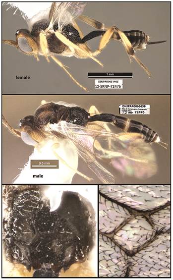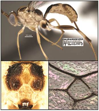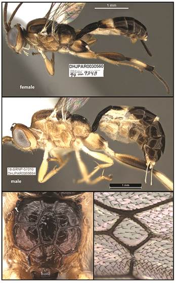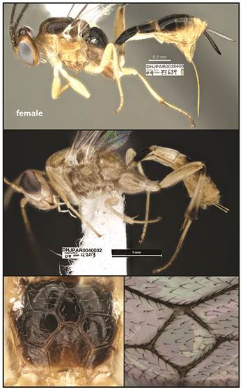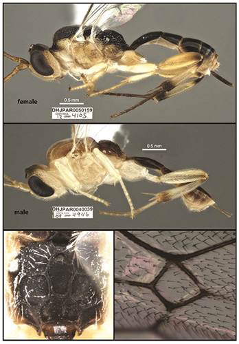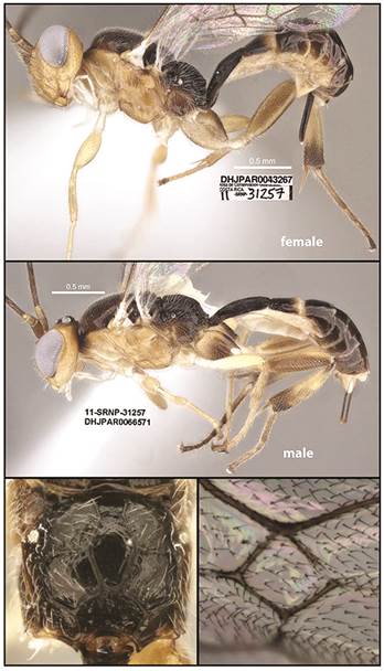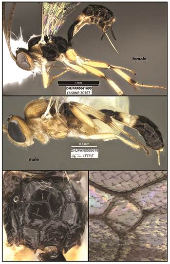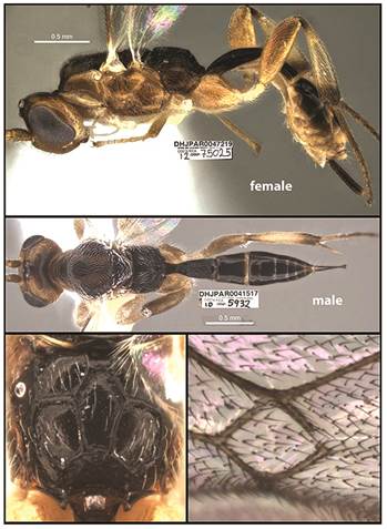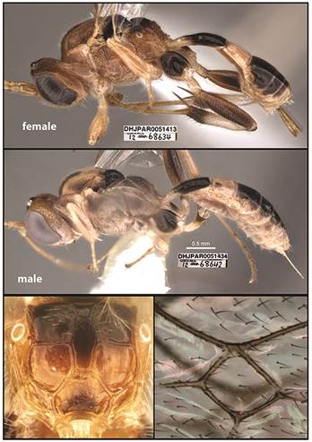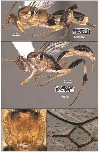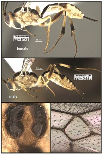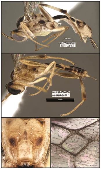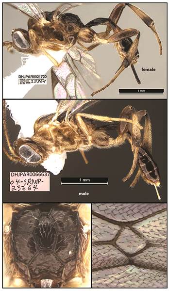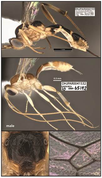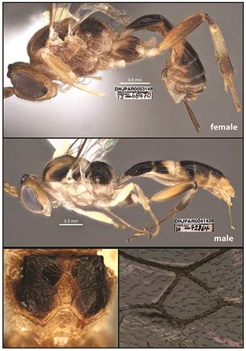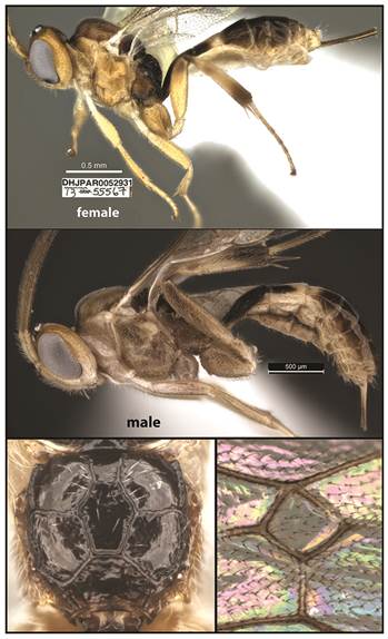 All of the species described here were collected by rearing wild-caught host caterpillars in ACG in northwestern Costa Rica (Janzen & Hallwachs, 2016) or caught in Malaise traps in the same forests. Holotypes of all newly described species are deposited in the Canadian National Collection of Insects (CNC), Ottawa. Paratypes will be deposited in the Museo Nacional de Costa Rica in Santo Domingo de Heredia, and the Los Angeles County Museum as duplicates become available. All other specimens, including hundreds of paratypes in alcohol, will also be deposited at the CNC. Undescribed but yet different species, generally with only one damaged specimen per BIN, are also deposited in the CNC until they are described and augmented with newly collected conspecifics as they are collected by the ongoing inventory.