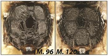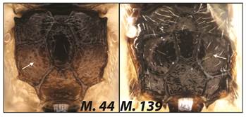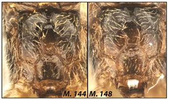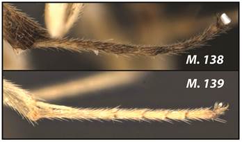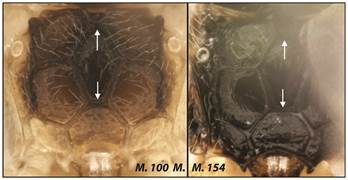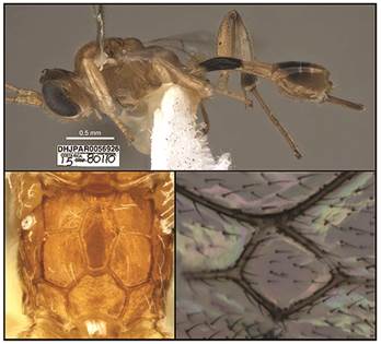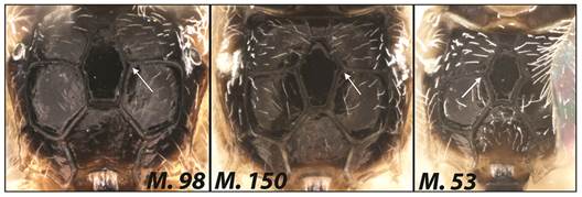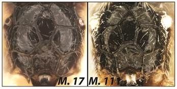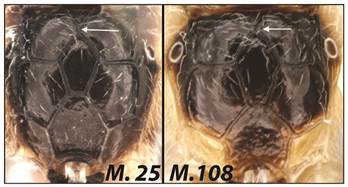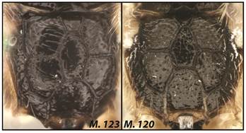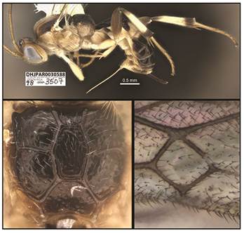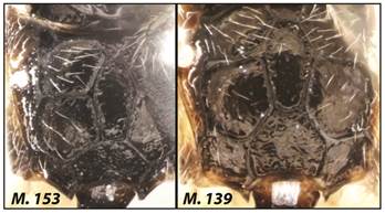 Nearest neighbor: M. unotresnueve, BOLD:ADQ8339, 1.92% (p-dist). The dimensions of the propodeal areolae differ (Fig. 182).
