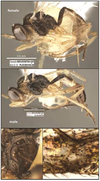 Meier et al. (2021) criticized the minimalist approach, and a response to their criticisms was recently published (Sharkey et al., 2022). However, there is one criticism that we also address here. Meier et al., noted that a number of the species described in Sharkey, Janzen et al. (2021) had COI barcodes that coded for identical amino acids. Their conclusion was, “These BINs have no known, functionally significant biological differences because the biology of these wasp “species” is not at all affected by which triplet codons are used to code for identical proteins. Given that most biologists associate speciation with the origin of biologically meaningful differences, describing such BINs as species rests on the hope that the correlation between time of divergence and the origin of new species is strong enough that biologically meaningful differences will later be found. However, most biologists are rightfully skeptical of results based on correlations and we would argue that it would be healthy to adopt the same position here.” One could equally argue that the ratio between the lengths of the first and second flagellomeres (functions, if any, unknown), or most any other morphological character used to differentiate species, is simply the result of drift due to time of divergence. Nonetheless, to address this criticism, we produced a NJ tree based on barcode amino acids and identified all identical clusters that contained multiple species of Mesochorus. Just as with the nearest neighbors with divergences of less than 3 %, we include images that morphologically differentiate these species that the amino acids do not. Without exception, the proposed species that shared identical COI amino acids were different morphologically, and sometimes dramatically so (Fig. 4). In the case of Costa Rican species of Mesochorus, the BIN algorithm, as a measure of time of divergence, is a good estimator of species status.