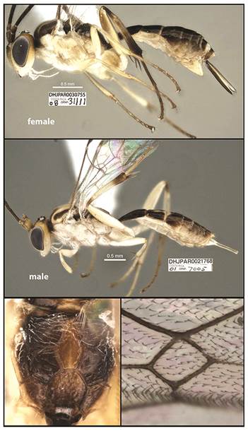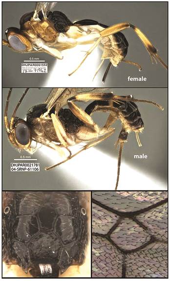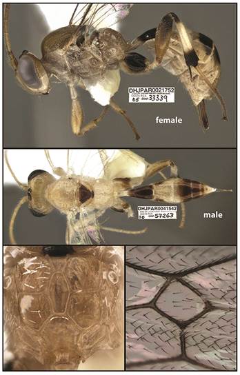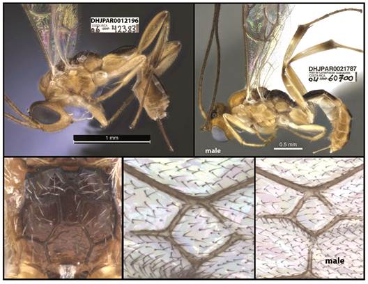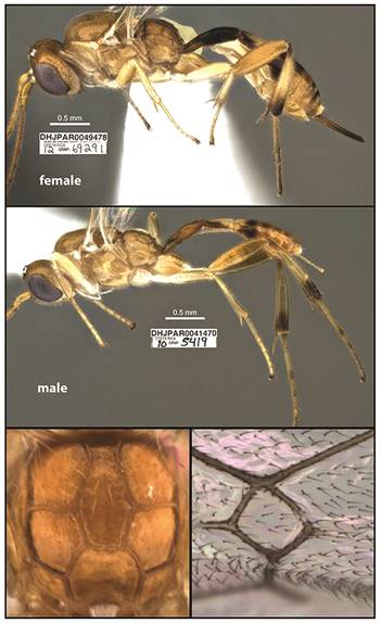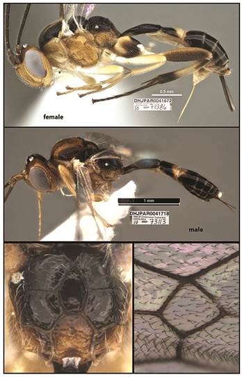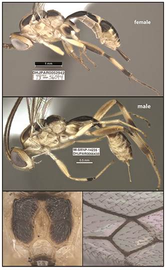 Voucher codes are presented here for all holotype specimens (and all other barcoded individuals) treated herein. All host caterpillars are individually vouchered to their individual records (yy-SRNP-xxxxx). Codes beginning with DHJPARxxxxxxx are for the parasitoid (or hyperparasitoid) specimens reared from the caterpillar; therefore, each wasp carries two voucher codes, one for the rearing (host) record and one for the wasp itself. A hyperparasitoid also carries the host caterpillar voucher code, but only the host caterpillar record retains the primary parasitoid data, if there are any. In other words, if there were survivors of the primary parasitoid as well as the hyperparasitoid, both records are in the total caterpillar voucher in the Janzen and Hallwachs database (http://janzen.sas.upenn.edu/caterpillars/database.lasso), updated copies of which are periodically deposited in the Lepidoptera division of the National Museum of Natural History in the Smithsonian Institution, and will eventually be publicly available not only through the University of Pennsylvania, but other web sites as well. Specimen voucher codes beginning with BIOUG are generated by the CBG and stored in BOLD (http://www.boldsystems.org), and most of the specimens obtained from ACG Malaise traps have this prefix. The DHJPAR and their associated SRNP codes can also be found on the BOLD database. The abundant collateral information obtainable from these two databases complements the species treatments. See Sharkey, Janzen et al. (2021) for a brief introduction to what to look for and how the two databases supplement the species treatments herein. Instructions on how to use BOLD to identify a specimen are given in Sharkey, Baker et al. (2021). GenBank and BOLD were both searched to ensure that none of the species described herein having matching barcodes with named species.