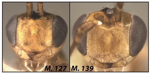 Here we include several standardized images of each holotype specimen and, if available, an image of a specimen of the opposite sex. We also include at the end of the publication a frontal image of the head of each species (SM3, Figs. S1-S27). The purpose of these images is to help users confirm the identifications that they arrived at using CO1 barcodes. Essentially, we expect that CO1 barcodes will be used to identify species; however, a check, for those fortunate enough to possess a quality microscope, will be to examine the images. The facial images at the end of this treatment are grouped because they offer perhaps the best diagnostic characters. The overall sculpture and color as well as the shape of the clypeus and mandibles may all be partly diagnostic. It is expected that, when someone barcodes a specimen of Mesochorus and has a hit on one of our species, they will examine these images to confirm their identification. This is a far better option than asking to borrow the holotype specimen which could be refused in many cases, e.g., taxonomists not affiliated with recognized institutions and those working in countries with unsecured postal services. In this revision the BINs all match the species concepts. With more intense sampling, a presumed “species” may be found to be more than one, as sometimes is the case for COI barcodes. This is occasionally anticipated by 1 % or less difference between two clusters of barcodes within a BIN; these are also hints for a closer look at the ecology of the wasps, if such data are available.