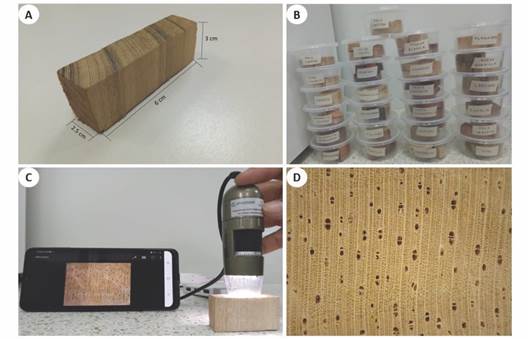 Las muestras recolectadas fueron etiquetadas con sus nombres comunes, luego fueron llevadas al Laboratorio de Anatomía e Identificación de la Madera de la Universidad Continental campus Incho, Huancayo para realizar la identificación y caracterización anatómica. Se obtuvieron secciones rectangulares (2.5 cm de ancho x 6 cm de largo y 3 cm de alto), evitando áreas con defectos (grietas, rajaduras o áreas podridas por organismos xilófagos) para evitar confusiones en la identificación de patrones anatómicos (da Silva et al., 2017) como se muestra en la Fig. 1.