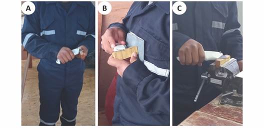 Dimensiones de una muestra: Determinar las dimensiones de una muestra de madera es esencial para una correcta manipulación y corte de la sección transversal, la captura de imágenes, su almacenamiento y conservación. Entre las dimensiones de muestras más utilizadas encontramos desde pequeñas (2 cm de alto x 1.5 cm de ancho x 4 cm de largo) (de Andrade et al., 2020) y medianas (4cm de alto x 5 cm de ancho y 10 cm de largo) (Kwon et al., 2017). Las dimensiones de las muestras se pueden observar en la Fig. 1A, el ancho de 2.5 cm facilita el corte de la superficie con las tres herramientas, en especial con la cuchilla Ubermann que posee una longitud máxima de 3 cm y el ancho de la muestra puede variar de 2 a 3 cm. Con respecto al largo de 6 cm, este estudio propone una longitud de 5 a 8 cm para mayor seguridad en el proceso de corte, ya sea fijado en un tornillo de banco o con las manos como se observa en la Fig. 2. Para el alto de las muestras se sugiere como mínimo 3 cm, dimensiones menores a este, podrían ocasionar accidentes o daño en los dedos. Las dimensiones pequeñas de las muestras permiten su almacenamiento y conservación para la estabilización de humedad y protección contra organismos xilófagos (Fig. 1B).