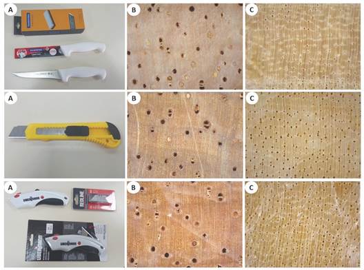 Results: Using three cutting tools, we obtained high quality images of the cross section of wood; 3 750 macroscopic images were obtained with a portable microscope and correspond to 25 timber species. We found the ''Tramontina'' knife to be durable, however, it loses its edge easily and requires a sharpening tool, the ''Pretul'' retractable cutter is suitable for cutting soft and hard wood in small laboratory samples and finally the ''Ubermann'' knife is suitable for use in the field, laboratory, and checkpoint, because it has a durable sheath and interchangeable blades in case of dullness.