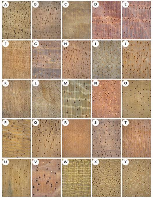 Obtención y preparación de muestras: Las muestras corresponden a 25 especies maderables de Selva Central, se obtuvieron dos tipos de muestras: i. Pequeñas piezas de madera de aserraderos de la provincia Chanchamayo y Satipo, y ii. Rodajas o secciones transversales de los árboles aprovechados por empresas madereras en bosques de comunidades nativas de la provincia Satipo, región Junín (Ferreira et al., 2021).