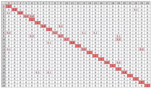 La numeración de las 25 especies maderables presenta el mismo orden de la Tabla 3 es decir, el número 0 en la matriz de confusión corresponde a la especie número 1: Caryocar glabrum (almendro) de la Tabla 3 y el número 24 de la matriz de confusión corresponde a la especie número 25: Enterelobium sp. (yarahuisca) descritas en la Tabla 3. La línea diagonal representa el porcentaje de clasificación correcta que realiza el modelo en la fase de validación. Por ejemplo, la especie Cedrela angustifolia fue clasificada correctamente con un 60 % de precisión, sin embargo, el modelo lo confunde con Cedrela odorata en un 40 %, esto debido a la similitud de sus características anatómicas como el tipo de porosidad semi-poroso y la demarcación de anillos de crecimiento por bandas de parénquima marginal (Ferreira & Inga, 2022), además, los poros presentan diámetros distintos asociados a una coloración más clara a rosada en C. angustifolia y roja en C. Odorata con poros más grandes cerca del parénquima marginal.