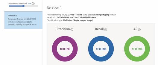 Dentro del modelo EfficientNet B0, el 80 % de imágenes fue para entrenamiento y el 20 % para validación y para las pruebas se realizaron con imágenes que no están dentro de la base de datos, mientras que en el modelo ''Custom Vision'' de la plataforma Microsoft Azure no se puede acceder a la distribución de imágenes para dividir imágenes en la fase de entrenamiento y validación. Sin embargo, recomienda el uso de 50 imágenes como mínimo por especie para realizar una buena clasificación. Por esta razón, el entrenamiento se realizó con 50 imágenes por especie en un tiempo de 4 h como se muestra en la Fig. 6, mostrando un 100 % de precisión en la clasificación.