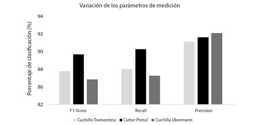 La Fig. 7 muestra gráficamente la variación de los parámetros de medición que se indicaron en la Tabla 6, se puede ver que la precisión es el valor con mayor porcentaje superando considerablemente a los parámetros de F1-Score y Recall, con las herramientas de cuchillo Tramontina y cuchilla Ubermann. Sin embargo, el estile retráctil Pretul no muestra demasiada amplitud entre los tres parámetros.
