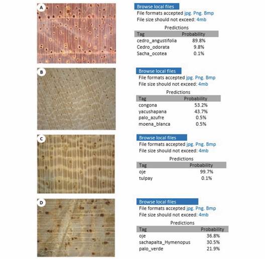 Al igual que la familia Meliaceae, existen varias especies que conforman una sola familia como Lauraceae, son complejas de identificar mediante la taxonomía botánica y aún más con la anatomía de la madera. Para ello, el modelo ''Custom Vision'' de Microsoft Azure tiene la facilidad de cargar imágenes y al culminar el entrenamiento la plataforma te permite realizar test de prueba, que consiste en cargar solo una imagen y clasificará de acuerdo con la similitud de características encontradas dentro de la base de datos. En la prueba se encontró que la precisión del 100 % disminuye a 89.8 % con la especie Cedrela angustifolia confundiéndose con Cedrela odorata en un 9.8 % como se observa en la Fig. 8A; Brosimum alicastrum disminuye a 53.2 % de probabilidad de reconocimiento confundiéndose en un 43.7 % con Terminalia oblonga presente en la Fig. 8B.