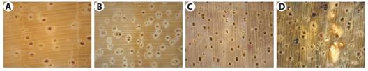 Las imágenes presentes en la Fig. 4 muestran una mejor visualización de sus características anatómicas en orientación vertical en función de sus radios, estas imágenes fueron obtenidas al hacer el corte de la sección transversal de la madera con el estilete retráctil Pretul.