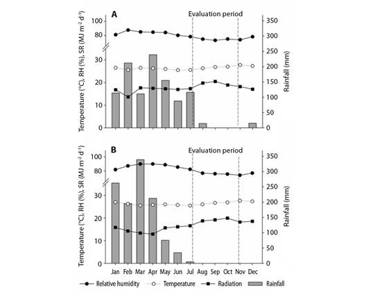 Experimental area: Data were collected from dwarf-type cashew plants that were vegetatively propagated and cultivated under rain-fed conditions in an experimental field of Embrapa Agroindústria Tropical, in the municipality of Pacajus in Ceará, Brazil (4º10'21'' S & 38°27'50'' W). The predominant climate of the region is humid hot tropical (Aw, in the Köppen Geiger climate classification), with an average annual temperature of 26 °C and an average annual rainfall of 1 020 mm (Kottek et al., 2006). The meteorological data recorded in the experimental area in 2018 and 2019 are presented in Fig. 1.
