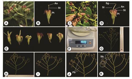 According to Violle et al. (2007), the functional traits of plants can be defined as the morphological, physiological and phenological characteristics that directly impact the performance reproduction of individuals, thus influencing their aptitude for a given environmental condition. Based on its attributes, which represent the different values that a given functional trait can assume (Appendix), the characterization of the floral structures of A. occidentale L. (Fig. 2) was carried out through the evaluation and classification of panicles, according to the following parameters: Number of male flowers: counting the number of male flowers with approximately 10 stamens (male organ of the flower), with one stamen being more developed than the others. Number of hermaphrodite flowers: counting the number of hermaphrodite flowers with small stamens and a pistil, the latter of which is generally longer than the most developed stamen and is attached to the ovary. Number of abnormal flowers: counting the number of flowers with an arrangement similar to that of male or hermaphrodite flowers, but with no pistil or larger stamen. Panicle biomass: determined by weighing the panicles. Panicle length: the distance from the first node to the apex. Maximum panicle width: the maximum distance between the ends of the panicle branches. Number of panicle branches: counting the number of branches originating from the main axis of the panicle (primary branches) and from the branches that develop from the primary branches (secondary branches).