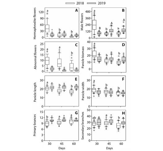 Methods: For the 2018 and 2019 harvests in 120 samples we measured number of male/hermaphrodite/abnormal flowers; panicle biomass, length, maximum width, and ramifications at 30, 45 and 60 days for 360 samples in total.