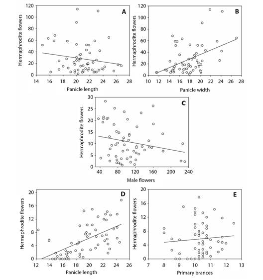 Results: The harvest effect was not significant. Panicle length and width (at 30 days), had the greatest contributions to the production of hermaphrodite flowers. The presence of male flowers (at 45 days), and the panicle length and number of primary branches (at 60 days) were the main factors at their respective periods.
