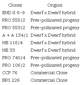 Genetic material: Ten clones of the dwarf cashew tree were selected in progeny experiments based on phenotypic evaluations of their suitability to edaphoclimatic conditions in the state of Ceará (Table 1). The selected clones differed with respect to several characteristics, including chestnut and peduncle productivity, average weight of chestnut and peduncle, peduncle color and shape, plant size, early flowering, fruiting, and the duration of these productive periods and almond yield.