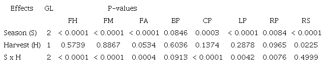 The period effect was considered as fixed in view of the particularities of each flowering period in the crop, specifically to enable conclusions to be drawn regarding panicle behavior in each of the three evaluation periods. The harvest effect was considered as random, with the aim of reaching broader conclusions regarding the responses of the cashew tree flowering, regardless of the agricultural year (harvest) considered. Block structure and the genotype factor were not considered in the analysis, to enable extrapolation of the results for the dwarf cashew tree. Thus, influences associated with flowering times of the two evaluated crops could be extrapolated to the whole, as time × harvest interactions have a random effect (Resende, 2005).