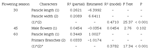 Resultados: El efecto de la cosecha fue insignificante. Longitud y ancho de la panícula (a los 30 días), tuvo la mayor contribución a la producción de flores hermafroditas. La presencia de flores masculinas (a los 45 días), y el largo de panícula y número de ramas primarias (a los 60 días) fueron los principales factores en sus periodos respectivos.