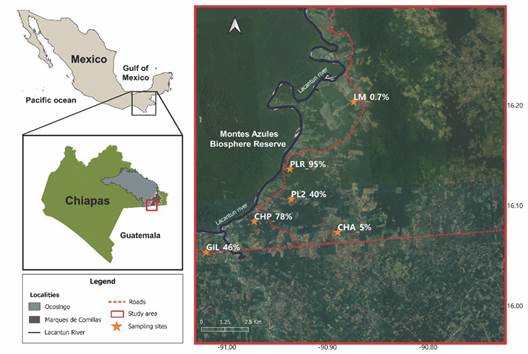 Study site: This study was conducted in the Marques de Comillas (MC) region which is part of the Lacandon forest in the state of Chiapas, Southern Mexico. The MC region has an extent of 94 266 km² (INAFED, 2010). It is limited to the West and North by the Lacantún river, to the South by the Guatemala border, and to the East and North by the Salinas river (Fig. 1). The Montes Azules biosphere reserve is located towards the west, covering an extent of 331 200.00 ha (Carabias et al., 2000). The mean annual precipitation in the region is 3 000 mm and the mean temperature is 24 °C (Martínez et al., 2009).