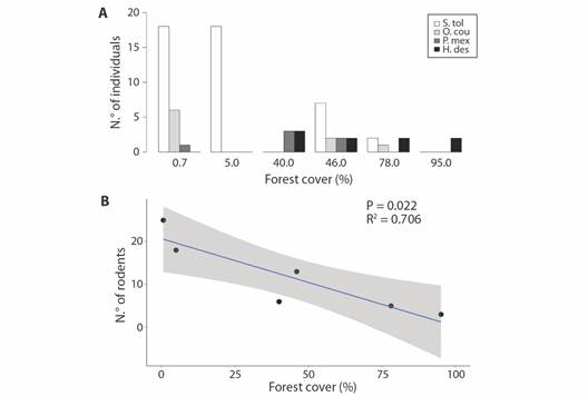 Results: We captured 70 rodents of five species: Sigmodon toltecus, Heteromys desmarestianus, Ototylomys phyllotis, Peromyscus mexicanus, and Oryzomys couesi. Rodent abundance increased with forest loss (R²= 0.706, P= 0.022). The greatest richness of rodent species occurred in sites with intermediate forest cover (40 and 78 %). The most abundant species were: S. toltecus (N= 45) followed by O. couesi (N= 9), these species dominated in sites with less forest cover. We recorded a total of 23 ectoparasite species, three of them known to be zoonotic vectors: Amblyomma sp., Ornithonyssus bacoti, and Androlaelaps fahrenholzi.